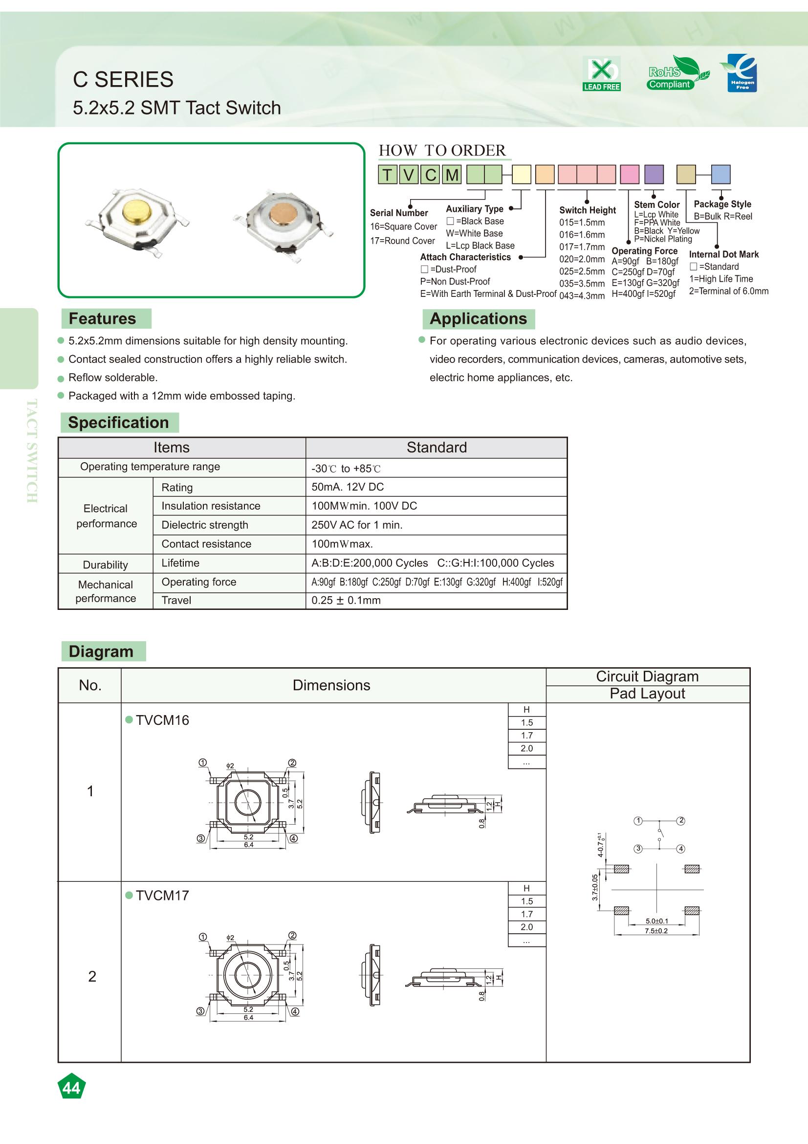 TVCM17015BPBАртикул: 275188 Микропереключатель TACT; Положения:2; 0,05A/12ВDC; SMT; OFF-(ON). Производитель: JIANFU |